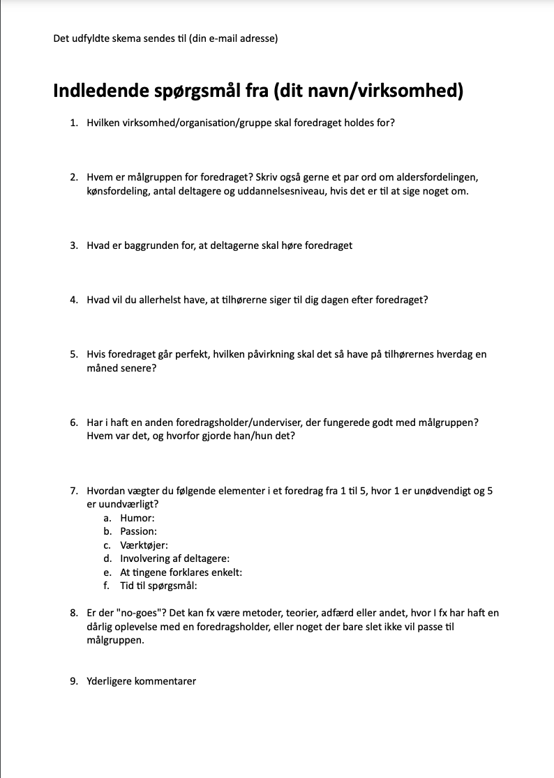 Template til spørgsmål til kunden (lukkede foredrag med f.eks. virksomheder)